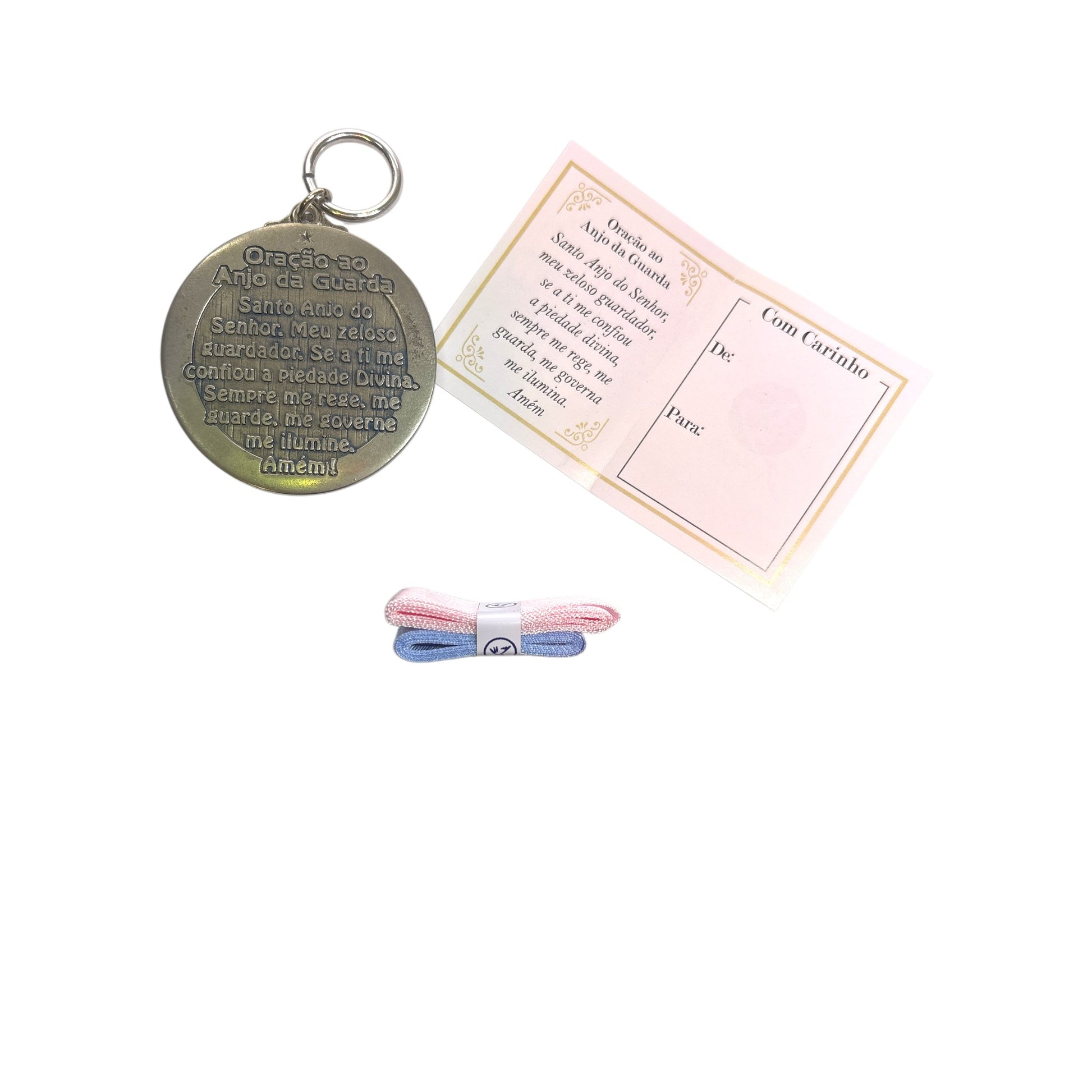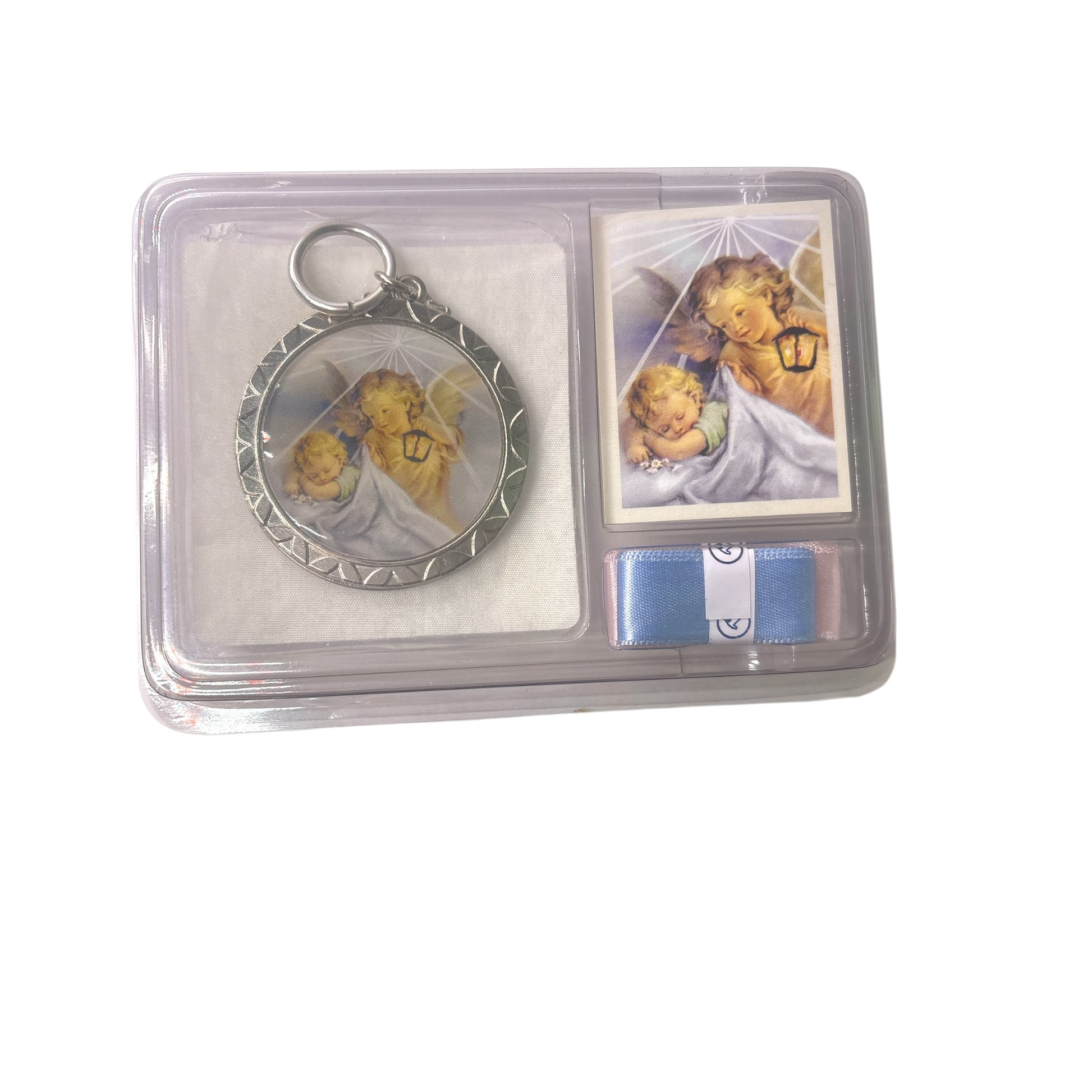 Features: Holy Angel prayer on back, flocked case, blue and pink ribbons, dedication card