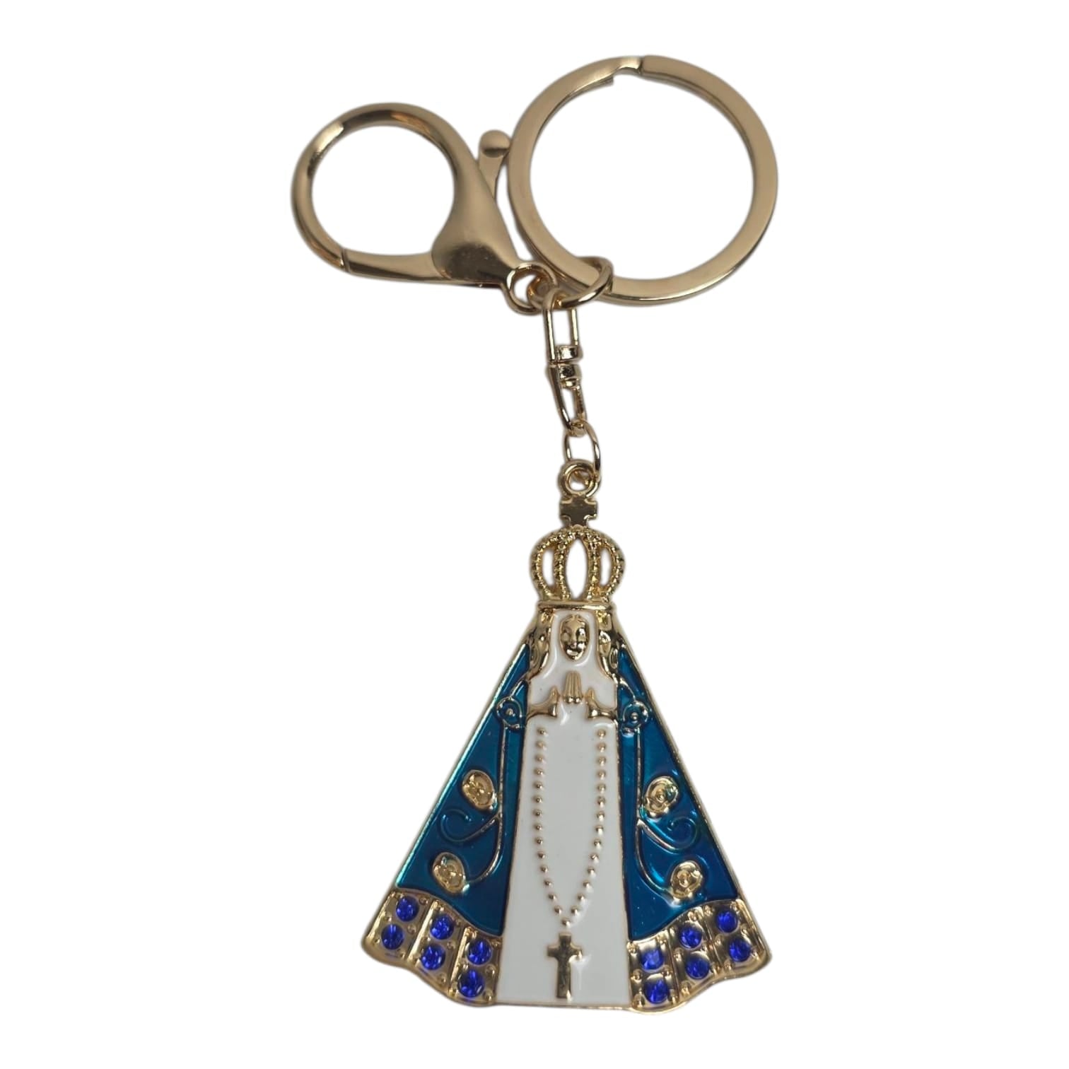 Elegant Design: The centerpiece showcases a finely detailed image of Our Lady of Aparecida, enhanced with enamel in classic blue and white hues. Delicate blue stones add a subtle sparkle, while the figure holds a rosary with a dangling crucifix for added reverence.