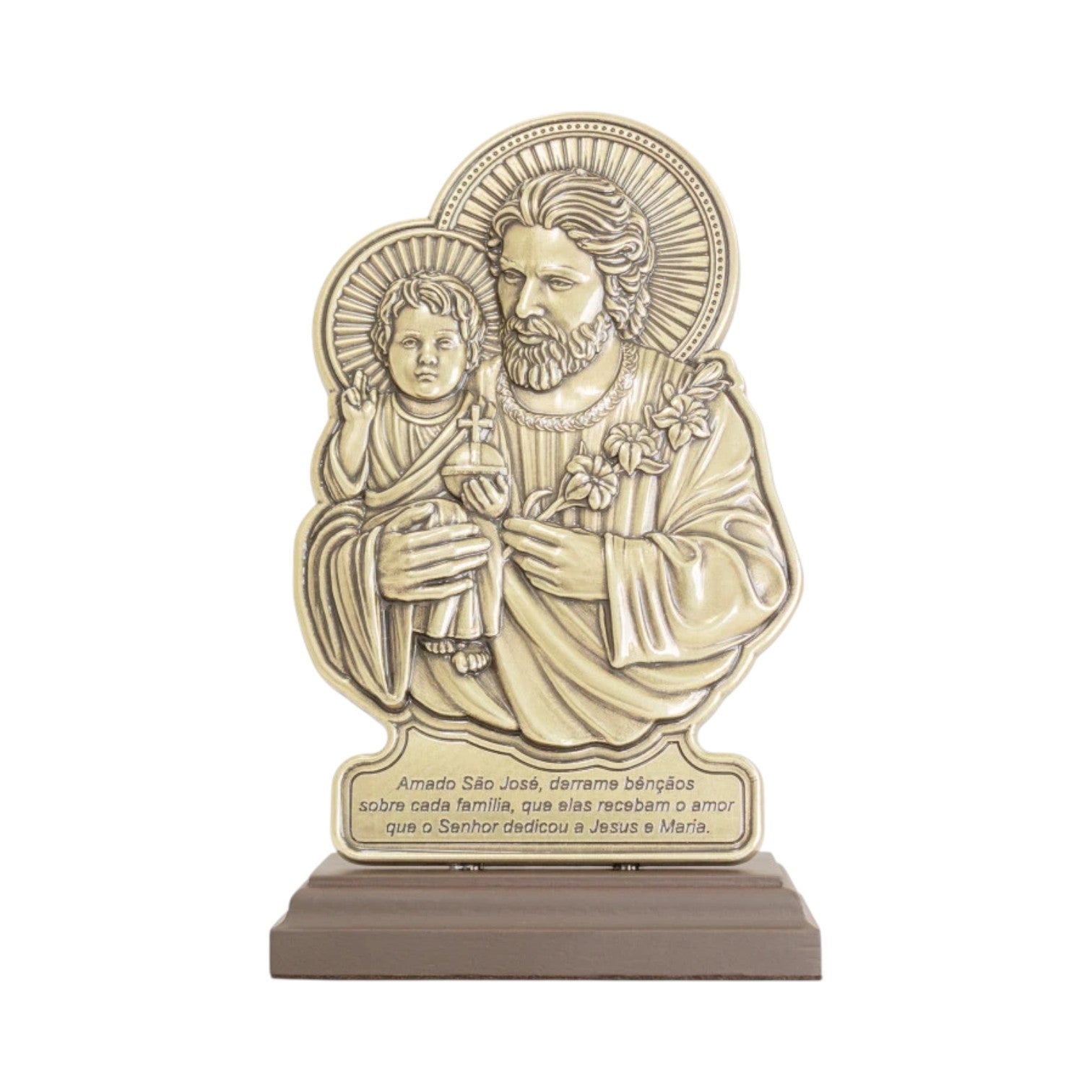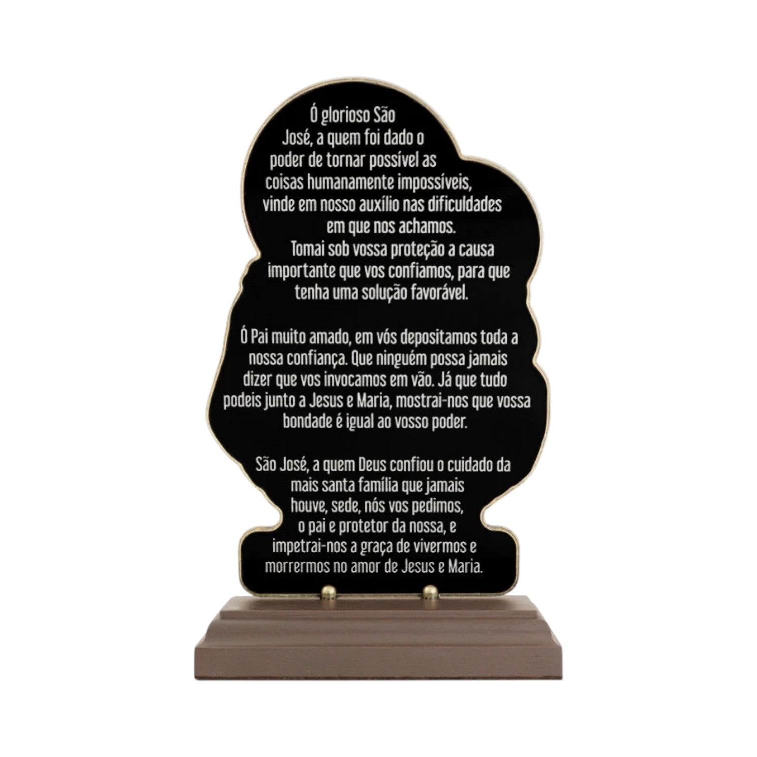 Mounted on an elegant noble wood base with a clear acrylic panel, the reverse side features the original prayer beautifully engraved in Portuguese, with the English translation provided below for your daily devotion: